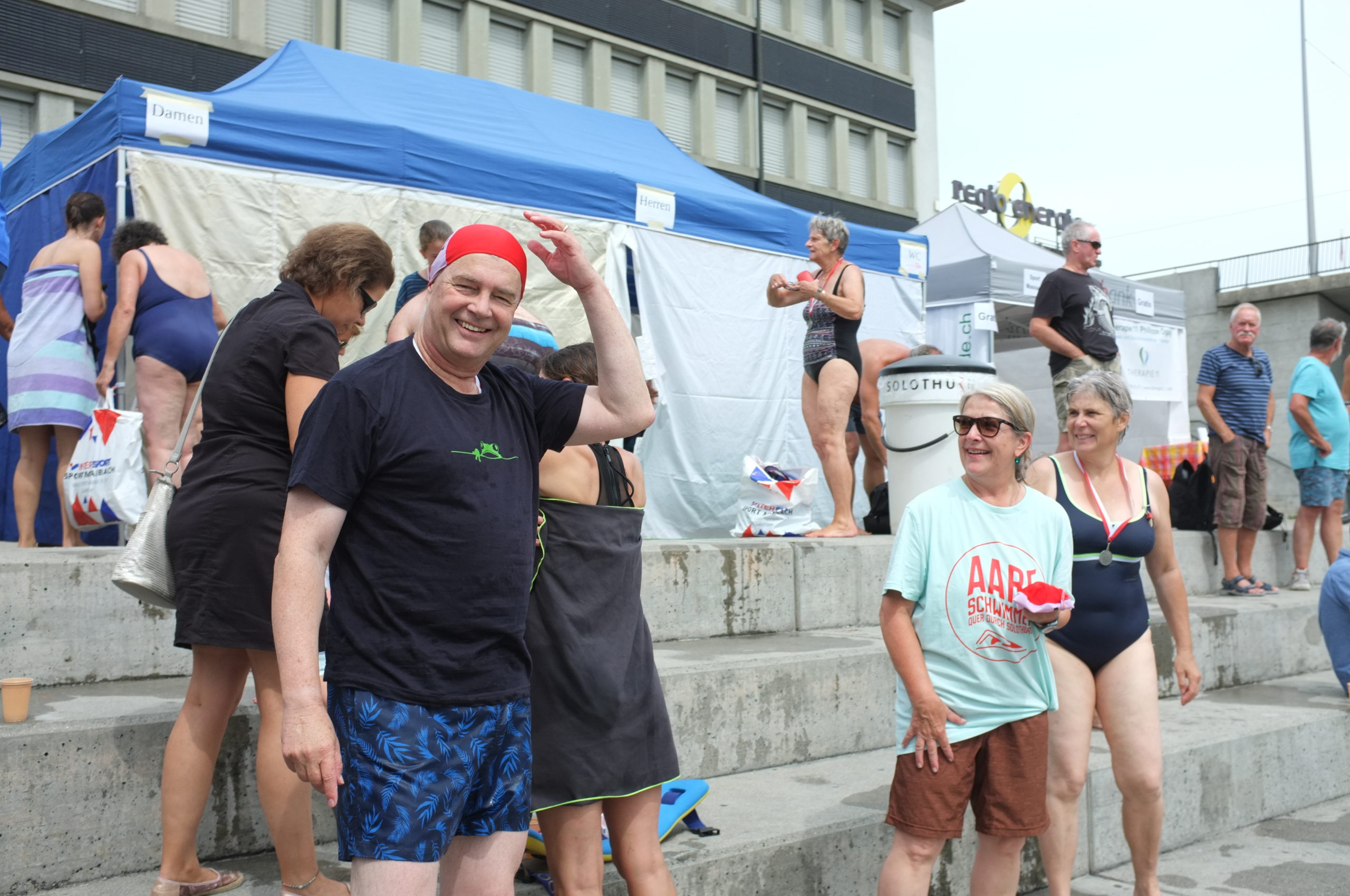 Der Aareschwumm durch Solothurn ist geschafft. Ich war ziemlich geschafft beim Ausstieg, nach 1.3 Kilometer im Wasser, das hier manchmal nur wenig vorankommt. Unter fünf Brücken hindurch ging’s, und der Blick auf die Stadt Solothurn direkt von der Wasserfläche her bietet unbekannte Perspektiven. Gleich wird mir die Badekappe Nummer 17 wieder abgenommen und die Medaille (die auch der Zweitletzte dieses Laufes verdient hat) umgehängt.